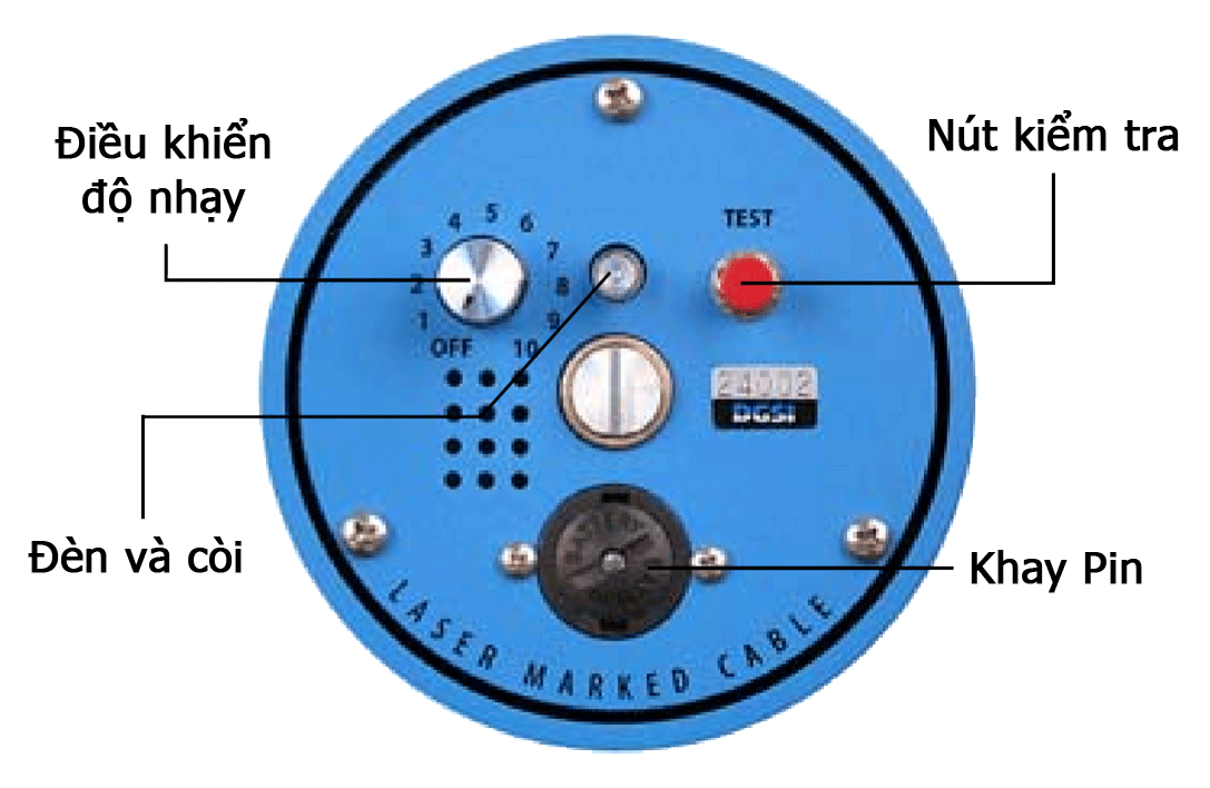 Ứng dung - Máy đo mực nước (thước đo mực nước) dùng để đo mực nước trong các ống đứng và các giếng quan trắc. Vận hành - Máy đo bao gồm một đầu dò gắn với dây cáp được khắc thước bằng laser và 1 lô cuốn dây. Bộ phận điều khiển nằm trong lô cuộn có pin, đèn và còi báo hiệu.Người đo thả đầu dò xuống ống quan trắc hay giếng quan trắc. Khi đầu dò chạm bề mặt nước, máy đo sẽ sáng đèn và phát âm thanh. Người đo sẽ đọc độ sâu mực nước qua thước khắc trên dây cáp