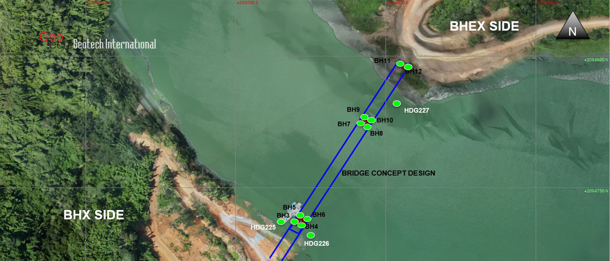 The work provided geotechnical borehole drilling, core logging, undisturbed soil sampling, standard penetration testing (SPT), and in-situ falling head permeability testing for geotechnical boreholes drilled at the site of the proposed BHX-BHEX Crossing Bridge in Xaisomboun Province of the Lao PDR.